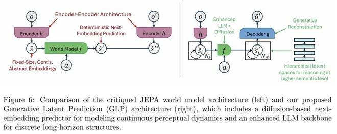 更好的方案不是抛弃生成模型,而是采用分层的生成式潜在预测(GLP)架构,这在图 6(右半部分)中得到了展示 。该架构包含一个解码器用于「生成式重构」 ,其核心是一个由「增强的 LLM + 扩散模型」构成的分层世界模型 。这种设计既能通过生成式解码器确保模型与真实数据挂钩,又能通过分层抽象来隔离底层噪声,实现更鲁棒、更强大的推理 。