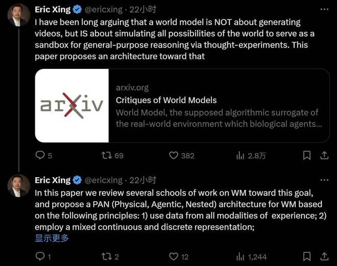 研究者表示,PAN 世界模型的详细信息及结果会很快在另一篇论文中展示。MBZUAI 校长、CMU 教授邢波在论文提交后转推了这篇论文,并表示PAN 模型即将发布 27B 的第一版,这将是第一个可运行的通用世界模拟器。