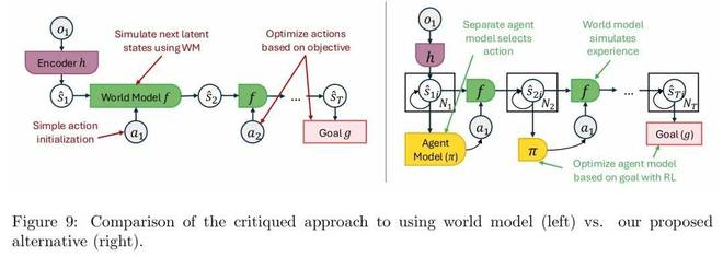 如论文图 9(左半部分)所示,MPC 在决策时需要反复进行「模拟下一个潜在状态」和「基于目标优化动作」的循环 ,这导致其计算开销巨大,难以应对快速变化的环境,并且通常视野有限,难以进行长时程战略规划 。
