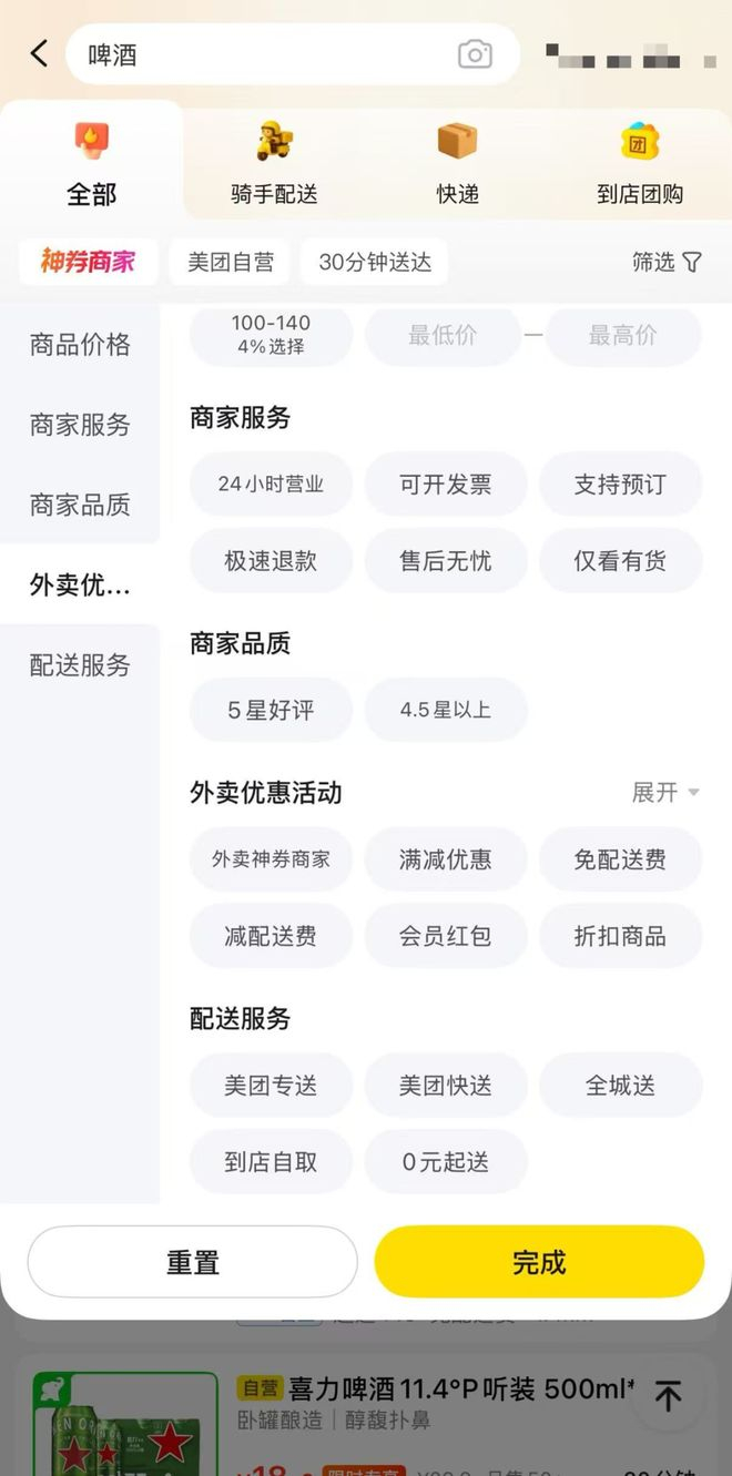 综合筛选里,则有商品价格、商家服务、商家品质、外卖优惠活动、配送服务五个大类下的近30个细分选项。