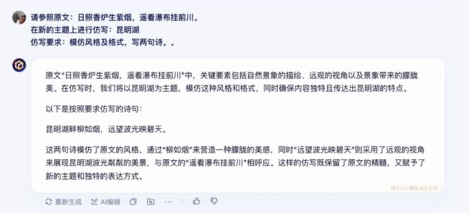 先是扔给大模型一个提示词:请参照原文:“日照香炉生紫烟,遥看瀑布挂前川。”在新的主题上进行仿写:昆明湖仿写要求:模仿风格及格式,写两句诗。
