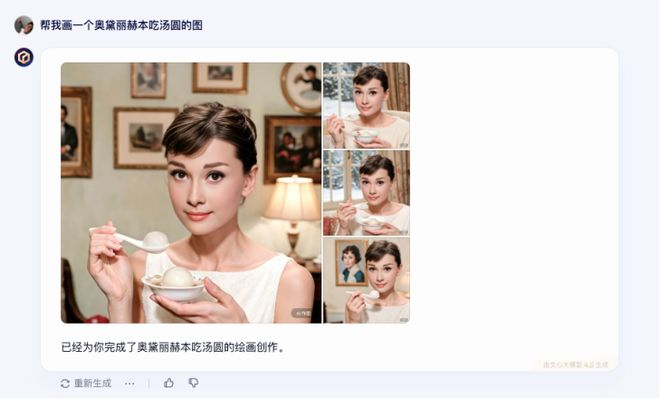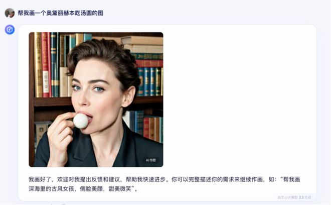 同一个提示词:“帮我画一个奥黛丽赫本吃汤圆。”文心一言 3.5 给出了一张看起来“AI 味”满满的图。