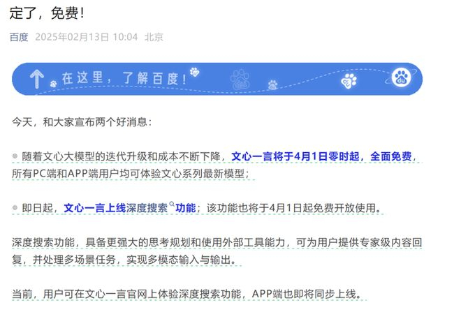 2 月 13 日,文心一言在官网宣布将于 4 月 1 日 0 时起全面免费,所有 PC 端和 App 端用户均可体验文心系列最新模型,以及超长文档处理、专业检索增强、高级AI绘画、多语种对话等功能。