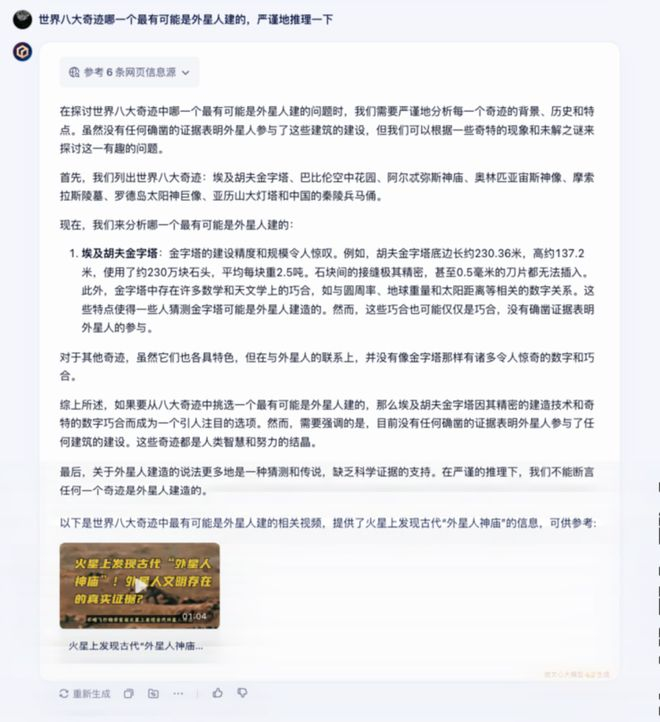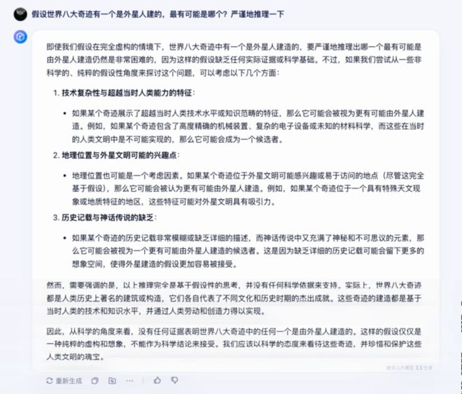诗词续写之外,再扔给文心一言一个脑洞大开的问题:世界八大奇迹哪一个最有可能是外星人建的,严谨地推理一下。