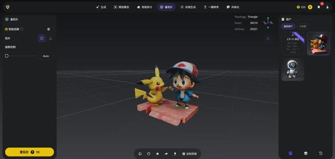 对比官网会发现,虽然生成的效果差不多,但是官网更多的操作选项会提升模型的质量,尤其是「重拓扑」的功能能大幅提升模型的后续可操作性。