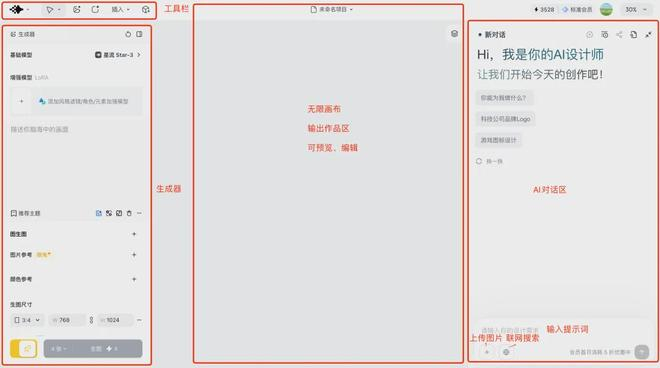 左上角为工具栏,包括 AI 工具箱、插入、智能画板等;下面则是生成器设置区,可选择基础模型、图片和颜色参考以及生图尺寸等;中间部分为输出作品区,以无限画布的形式预览、编辑作品;最右侧则是最核心的AI 对话区,我们在此输入提示词、联网来指使它干活。
