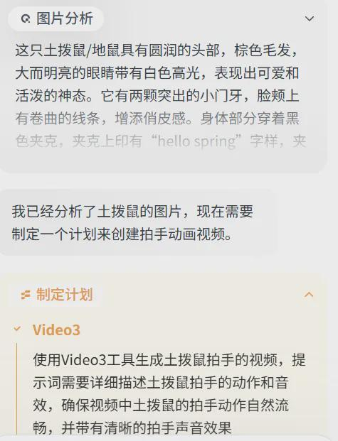 星流 Agent 立马响应,经过分析图像、制定计划、生成视频一通操作,最终生成的画面还算流畅,甚至还有向上运镜,只不过土拨鼠的眼睛稍有变化,耗时也较长,生成5秒视频足足用了三分钟左右。