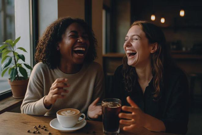 比如输入提示词:两位朋友在咖啡馆里大笑,纪实摄影风格,自然光。