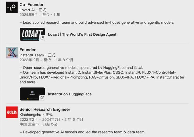 他的工作经历也是相当丰富。从 2017 年至今,他或兼职或全职干了 15 份工作,曾在中国科学院软件研究所、地平线机器人、OpenMined、快手、小红书实习或工作过,现在是 Lovart AI 的联合创始人。