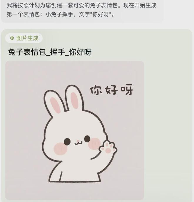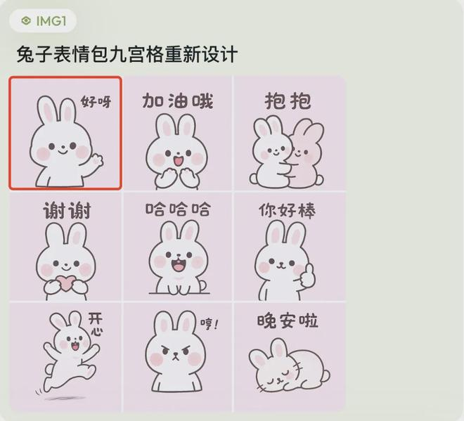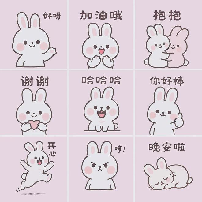 提示词:一套 9 个超级可爱超萌的表情包,9 宫格,一只可爱的小兔子,第一格是小兔子挥手的动作,文字是 “你好呀”;第二格是小兔子鼓掌的动作,文字是 “加油哦” ;第三格是两只小兔子拥抱的动作,文字是 “抱抱”,第四格是小兔子比心的动作,文字是 “谢谢”;第五格小兔子是大笑,文字是 “哈哈哈”;第六格是小兔子竖大拇指动作,文字是 "你好棒";第七格是小兔子开心跳跃的动作,文字是 “开心”;第八格是小兔子生气鼓腮的动作,文字是 “哼!” ;第九格是小兔子睡觉的动作,文字是 “晚安啦”。极简主义,手绘插图风格, 浅色主色。