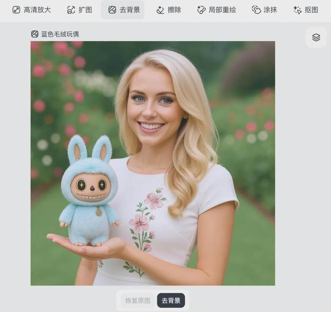 此外,我们也可以在无限画布上使用编辑工具修改,比如高清放大、扩图、去背景、擦除、局部重绘、涂抹或抠图等。