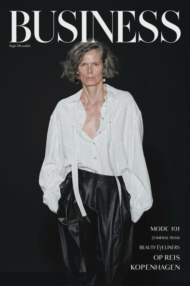 提示词:使用这张图片,创作高端时尚商业海报,展示穿蓬松白色服装的优雅女性。添加“Business”、“Negin Mirsalehi”、“MODE 101 ZOMERSE ITEMS”、“BEAUTY Eyeliners”、“OP REIS KOPENHAGEN”等文字内容。