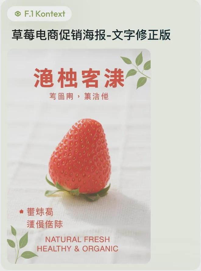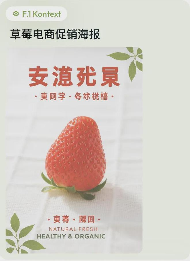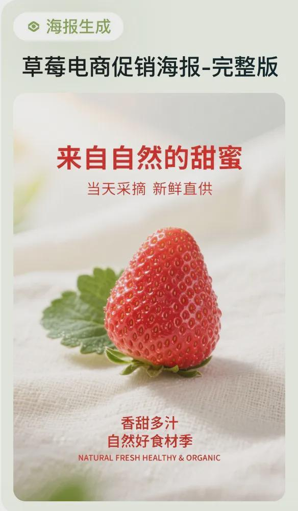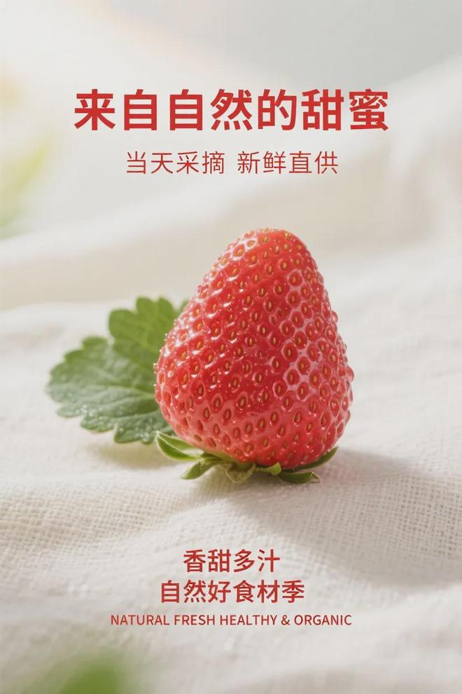 提示词:新鲜饱满的草莓,颗颗红润饱满,表面带有细腻水珠,质感细腻诱人,商品居于画面中央,色调以鲜艳草莓红为主基调,融入嫩绿叶片与象牙白装饰点缀,背景为天然棉麻织物,衬托出清新自然的气息。风格定位为自然健康,适用于电商促销海报创作,营造出清爽、安心、天然的视觉情感氛围。画面强调高品质食品摄影质感,采用自然主义手法表现水果真实状态,顶部设置醒目宣传语 “来自自然的甜蜜”,底部配文 “当天采摘 新鲜直供”,辅以点缀文字 “香甜多汁”,突出商品特性与吸引力;特别强调品质标语 “自然好食材季”,英文标识为 “NATURAL FRESH HEALTHY & ORGANIC”。文字采用清爽圆润字体,美观实用并重,画面层次清晰,商品质感突出,自然风格精准体现健康视觉冲击,设计输出须严格符合网格系统布局规范,确保元素对齐、间距统一、比例协调。