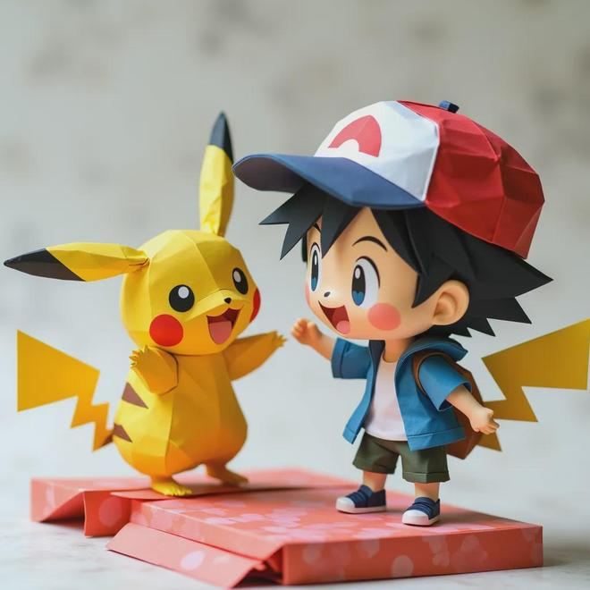 提示词:生成图片,Q 版小智和皮卡丘,站在比斗台上,背景虚焦,折纸风格,纸张层次丰富,动作多样,表情丰富,色彩鲜艳,立体动作,以独特姿势呈现,褶皱肌理,带点纸张纹理质感,干净背景,16K 分辨率,1:1