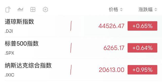 当天,美股三大股指全线高开,截至发稿,道指上涨0.65%,标普500指数上涨0.64%,纳指上涨0.95%。
