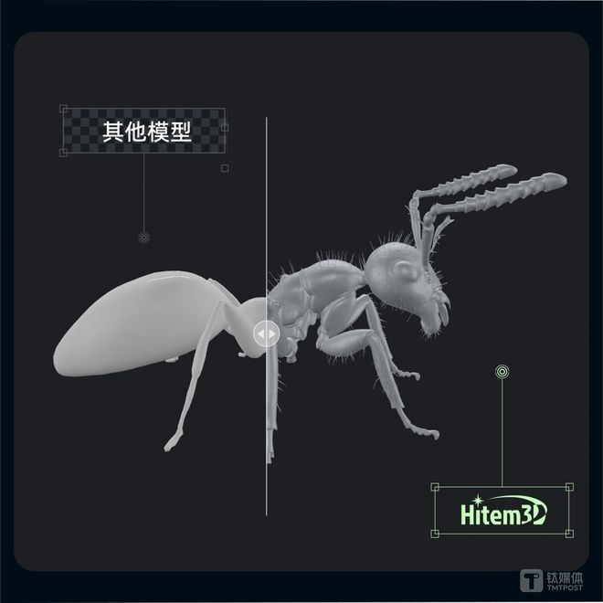 “我们首创图片输入、1536^3分辨率雕刻级 3D 模型直出,精微细节与微观结构得到前所未有的还原,你上传一张蚂蚁的微距照片,Hitem3D的三维建模,甚至可以将蚂蚁腿部的毛刺呈现出来!” 张勃说。