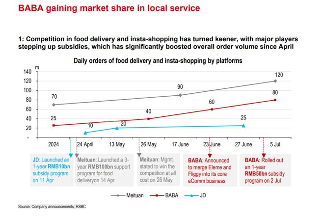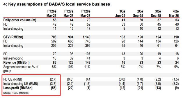汇丰将阿里巴巴FY26-28财年收入预期上调3-8%,反映即时零售和外卖订单量加速增长,但同时将盈利预期下调7-22%。汇丰预计,阿里巴巴FY26年外卖业务每单亏损2.7元人民币,即时购物每单亏损3.7元人民币,整体本地生活服务业务将亏损550亿元人民币。投资高峰预计在9月季度,之后在2026财年下半年逐步正常化。