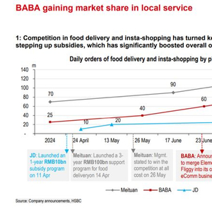 自2024年4月以来,外卖配送和即时零售竞争愈发激烈。美团在4月14日推出为期三年、总额1000亿元人民币的外卖支持计划,并在5月26日宣布“不惜一切代价赢得竞争”。京东则在4月11日启动为期一年、总额100亿元人民币的外卖补贴项目。