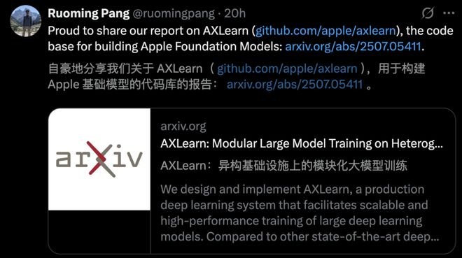 此前彭博爆料,庞若鸣在内部带领了约100人团队,打造支持苹果AI和下一代Siri的大模型。