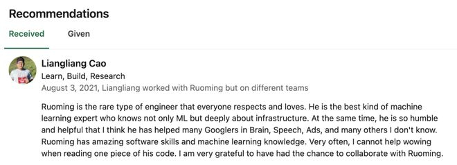 现谷歌Gemini主管Liangliang Cao曾对庞若鸣本人称赞道: