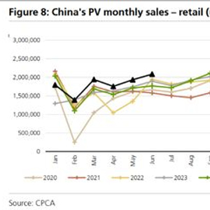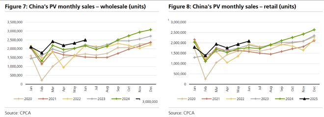 据中国乘用车协会数据显示,6月批发销量升至250万辆,同比增长15%,环比增长8%。零售交付强劲,达到210万辆,同比增长18%,环比增长8%。