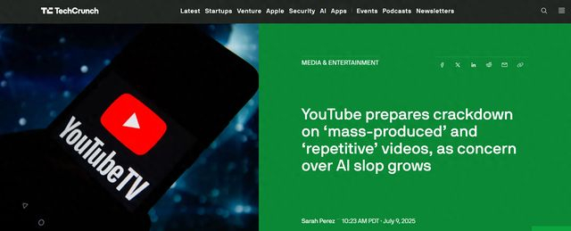 【环球网科技综合报道】7月10日消息,视频平台YouTube近日对其合作伙伴计划(YPP)的货币化政策进行更新,进一步明确内容盈利标准,重点打击利用人工智能技术批量生产的重复、低质“不真实”内容,以维护平台生态与用户体验。