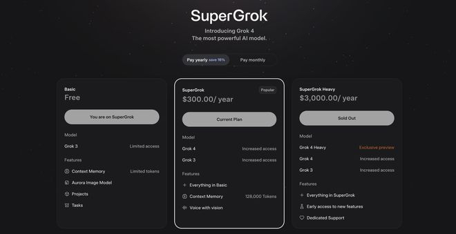 至于 Grok 4 能不能配得上「最聪明 AI」的称号,还得看后续的实际体验。不过,有一点是跑不了的——它已经成了市面上最贵的 AI,年订阅价格最高可达到 3000 美元,定价策略可谓是相当不讲武德。
