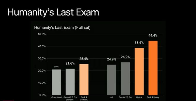 根据 xAI 数据,Grok 4 在不使用任何工具的情况下,得分为 25.4%,超过了 Google Gemini 2.5 Pro 的 21.6% 和 OpenAI o3(高配版)的 21%。