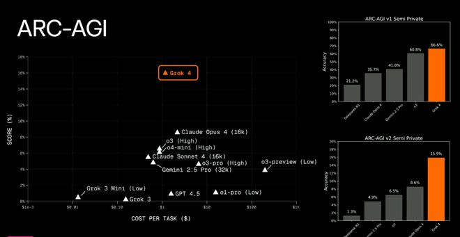 非营利组织 Arc Prize 也指出,Grok 在其 ARC-AGI-2 测试中创下新纪录。这是一项视觉推理类基准测试,AI 需识别图像中的模式。Grok 的得分为 16.2%,几乎是当前排名第二的 Claude Opus 4 的两倍。