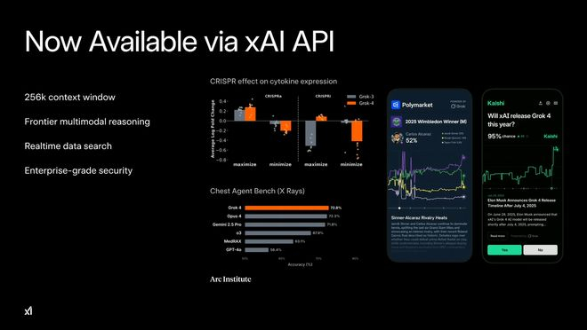 在科研领域,Grok 4 已被用于 CRISPR 基因研究和胸片 X 光分析。它能在几秒钟内读完几百万条实验记录和日志,自动筛出最有可能成功的假设。