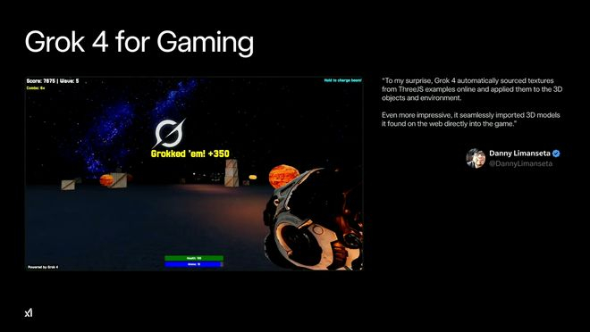 此外,像是金融领域、游戏开发等项目,都可以通过 xAI API 来使用 Grok 4 来实现。发布会上特别提到了一个游戏设计师,他在 xAI 发布了 Grok 4 预览 API 后,就立刻参与测试。然后,他花了短短 4 小时就做出了一个第一人称射击游戏。