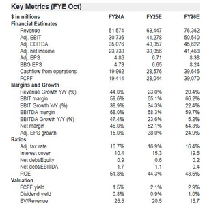 摩根大通预计,博通2025财年EPS将同比增长38%,达到6.71美元,2026年继续增长25%至8.38美元。自由现金流预计在2026年达到390亿美元,净负债率由2024年的0.9降至2026年的0.2,财务状况稳健。