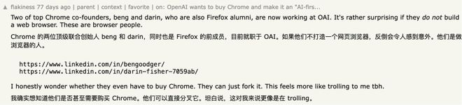 4月份的时候,谷歌面临Chrome反垄断的调查,那时候OpenAI的高管站出来说他们有意愿买下Chrome。