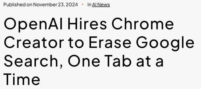 2024年11月23日,OpenAI宣布他们找到了「Chrome的创造者」来逐步挑战谷歌搜索霸权。
