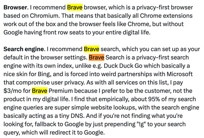 确实,天下苦Chrome久矣,这不是我说的,而是大神Karpathy自己说的,他曾经发帖说过,他现在更喜欢用Brave浏览器来代替Chrome。