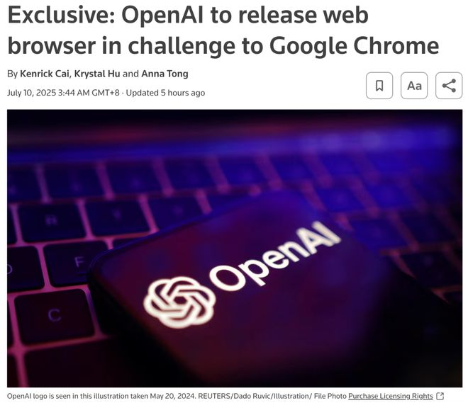 就在刚刚,路透社独家消息,OpenAI准备自己发布一个全新的浏览器!