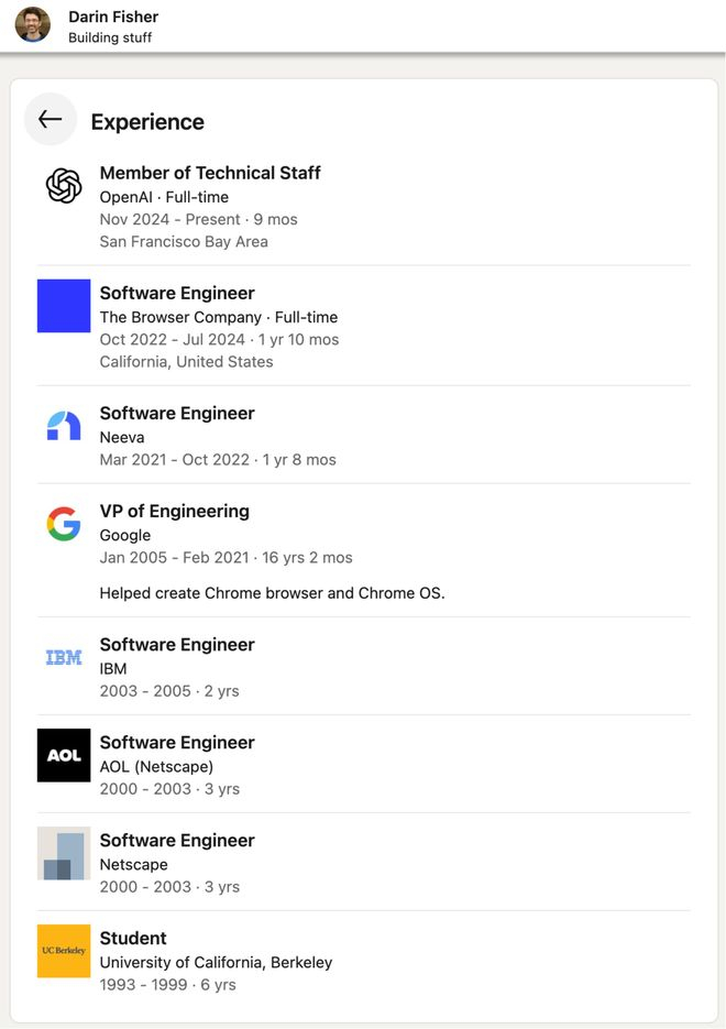 Darin Fisher工作经历,从Netscape到Firefox,再从Chrome到Arc,最后停留在OpenAI,似乎天生就是AI浏览器而生。
