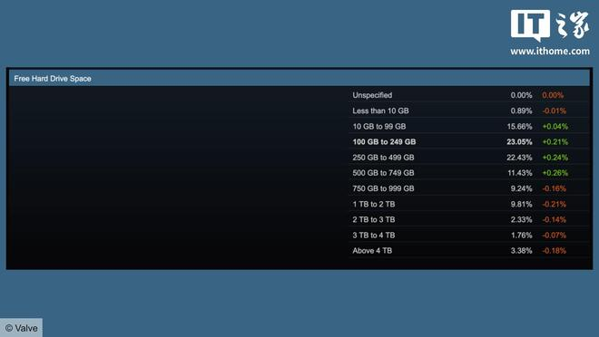 Valve 最新发布的调查结果显示,15.66% 的受访玩家目前仅有 10GB 到 99GB 的可用存储空间,另有 23.05% 的玩家拥有 100GB 到 249GB 的剩余空间。