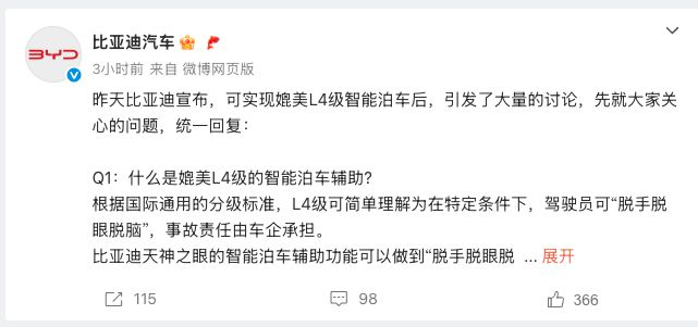 比亚迪汽车表示,兜底权益中的“媲美L4级的智能泊车”是指责任划分的不同——根据国际通用的分级标准,L4级可简单理解为在特定条件下,驾驶员可“脱手脱眼脱脑”,事故责任由车企承担。