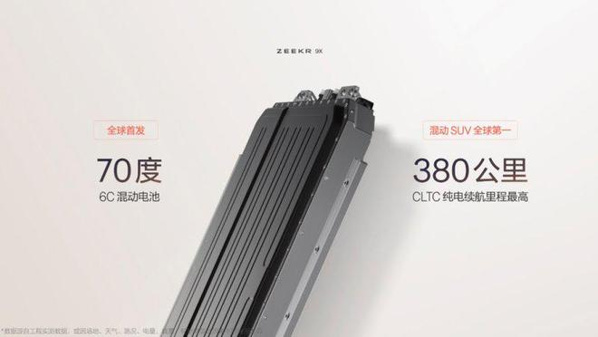 续航方面,基于浩瀚-S架构行业最优的三电布置能力,极氪9X搭载了70千万·时混动大电池,最大充电倍率6C,配合极氪全栈自研的混动热管理技术,彻底打破混动SUV纯电续航局限,CLTC续航里程达到380公里,综合续航里程超过1000公里, 电池从20%补能至80%仅需9分钟。