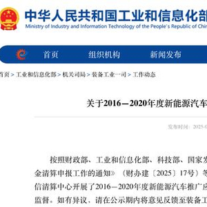 《公示》显示,按照财政部、工业和信息化部、科技部、国家发展改革委《关于开展2016—2022年度新能源汽车推广应用补助资金清算申报工作的通知》(财办建〔2025〕17号)等文件要求,工业和信息化部装备工业一司委托工业和信息化部通信清算中心开展了2016年至2020年度新能源汽车推广应用补助资金清算审核工作。