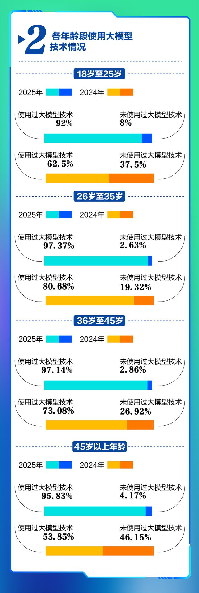 各年龄段使用大模型的人数均有所提升,其中,45岁以上受访者增幅最高。在18岁至25岁、36岁至45岁、45岁以上年龄段受访者中,使用过大模型技术的人数占比均超过90%,分别为92%、97.14%、95.83%。