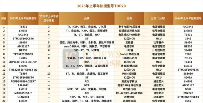 排名前三的电源管理芯片TL431、信号处理芯片LM358和电源管理芯片UC3842均属于通用性强、技术成熟的“经典料”。这类芯片的功能定义、引脚封装、性能参数已形成行业默认标准。