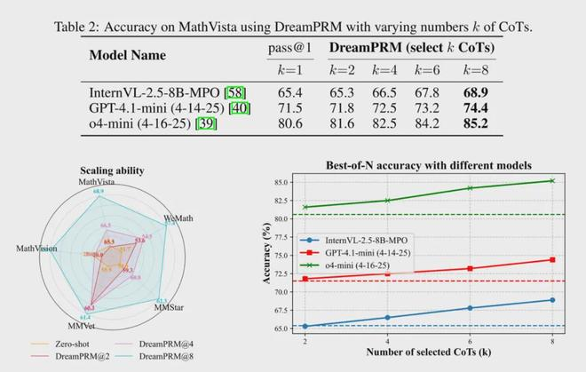 实验表明,该方法不仅能提升基础模型 4% 的平均性能,还可无缝迁移至 o4-mini 等新模型,且随着候选推理链数量增加持续改善结果。DreamPRM 的细粒度过程监督和可解释的权重分配,为多模态过程奖励模型的高效训练提供了新范式。