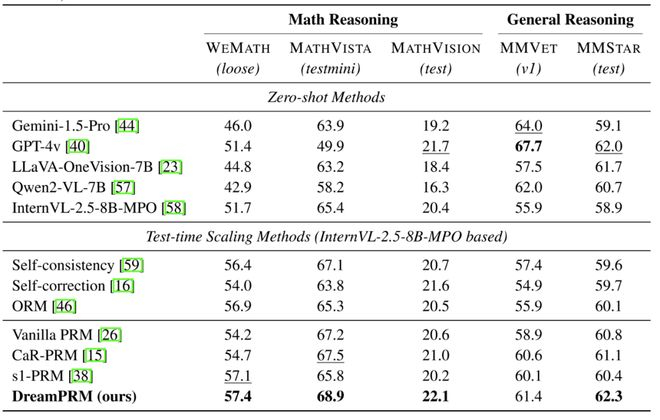 DreamPRM 通过创新的双层优化机制,成功解决了多模态过程奖励模型训练中数据质量失衡和分布偏移的难题。双层优化框架自动学习各数据域的最优权重,使 DreamPRM 在五项基准测试中全面超越一般 PRM 方法,尤其在高难度数学推理任务上表现突出。