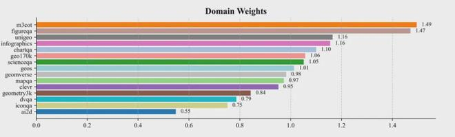 这个双层架构创造了一个自适应的正反馈循环:高质量的推理数据域(如需要复杂跨模态推理的 M3CoT)会逐渐获得更高的权重,而包含大量简单样本的域(如 AI2D)的权重则会下降。整个优化过程展现出良好的收敛特性,初始设为 1.0 的域权重会在训练中自然分化,最终形成与数据域信息密度高度相关的权重分布。