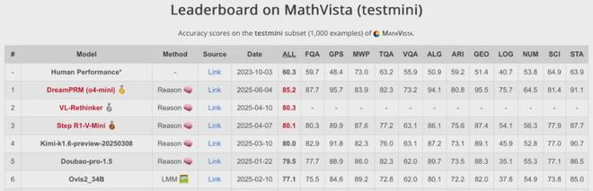 DreamPRM 方法在 MathVista 数学推理排行榜上荣登榜首。DreamPRM 以多层级优化为核心,作为一个与具体大语言模型无关的通用框架,可与任何多模态大语言模型无缝集成,显著提升其数学推理能力。