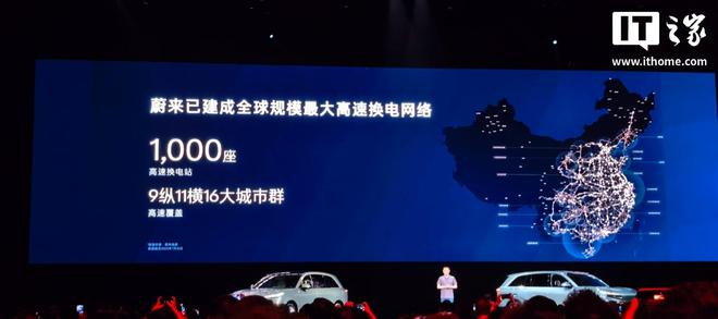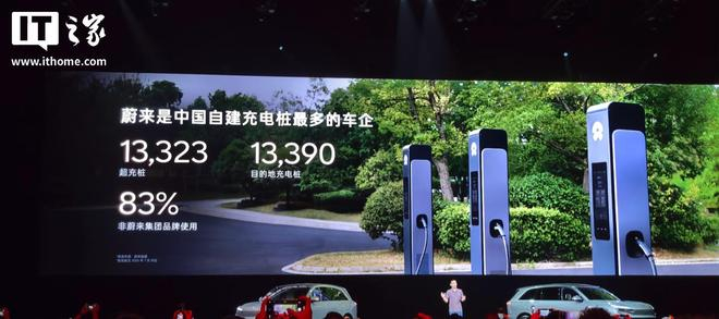 李斌还透露,蔚来已经建成全球规模最大高速换电网络,拥有 1000 座高速换电站,覆盖 9 纵 11 横 16 大城市群。同时,蔚来还是中国自建充电桩最多的车企:包含 13223 座超充桩、13390 座目的地充电桩。