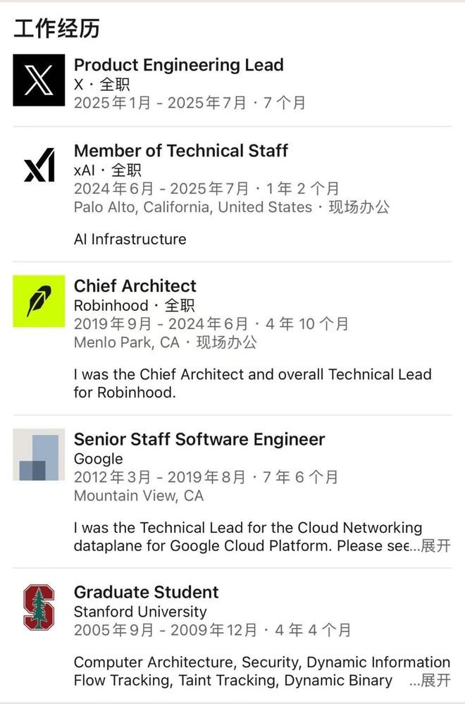 乌代·鲁达拉朱(Uday Ruddarraju),曾在ebay工作过5年的时间,2018年跳槽Robinhood,后又在2024年6月跳到xAI和X担任基础设施工程主管一职,刚一年就再度跳槽。