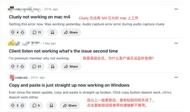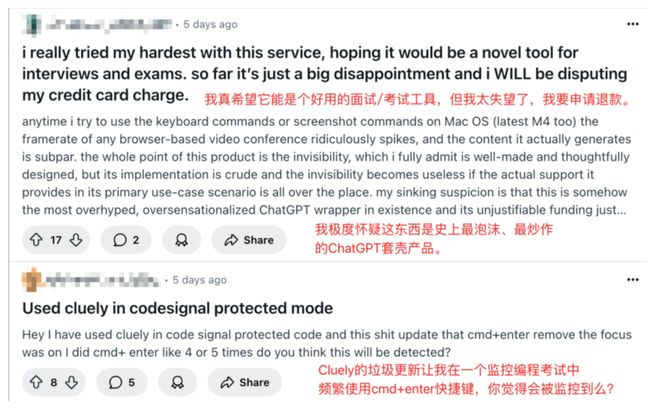 而另一边,已经大胆尝新的用户基本都是在怒喷 Cluely。大家的喷射范围几乎覆盖了这款产品的方方面面,多到刷不完。